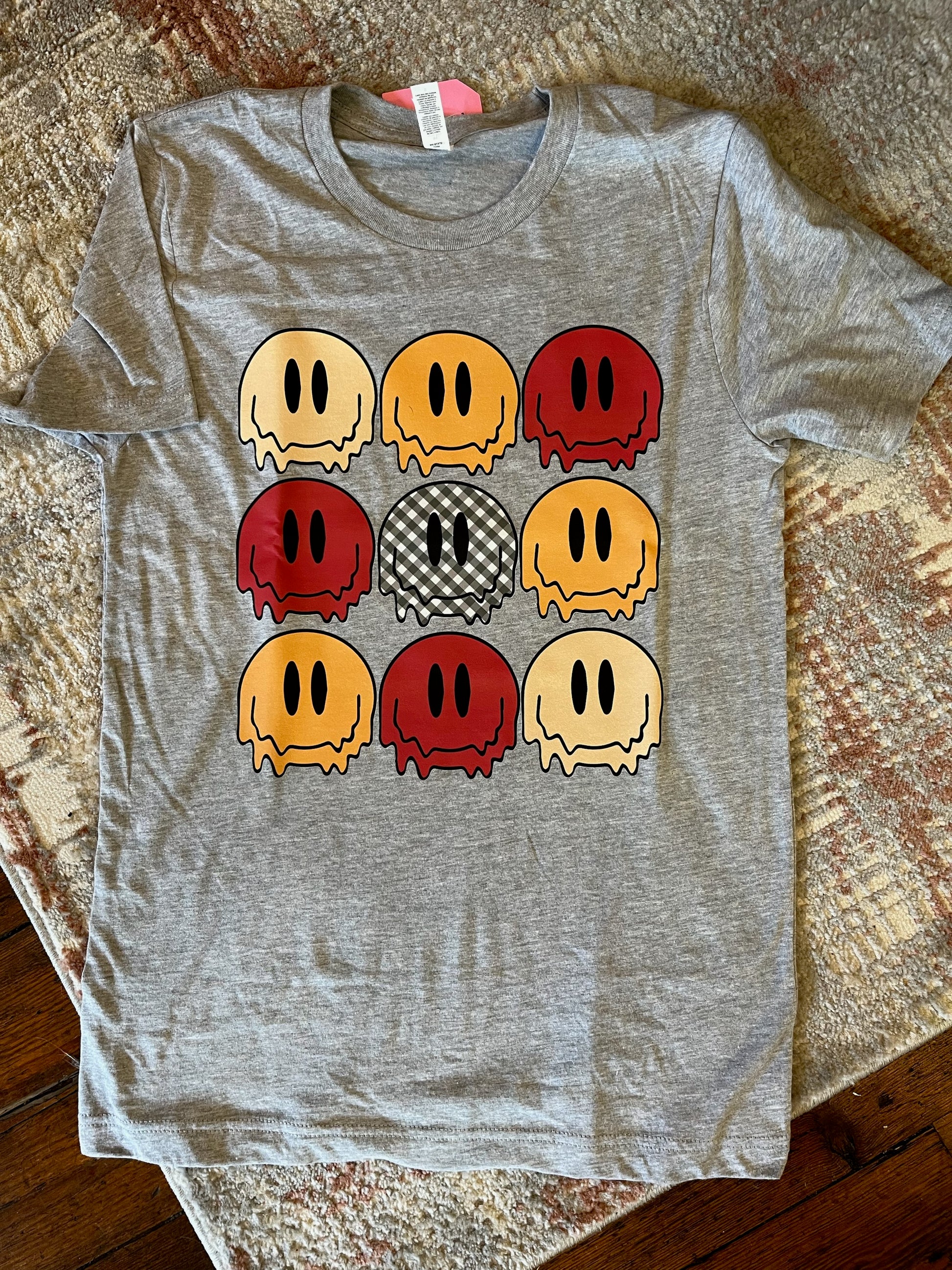 Spread happiness this fall with our Fall Smiles Tee! This cute t-shirt features a cheerful happy faces in autumn hues, making it the perfect addition to your fall wardrobe. Let your positivity shine and embrace the season with this playful and comfy shirt.
