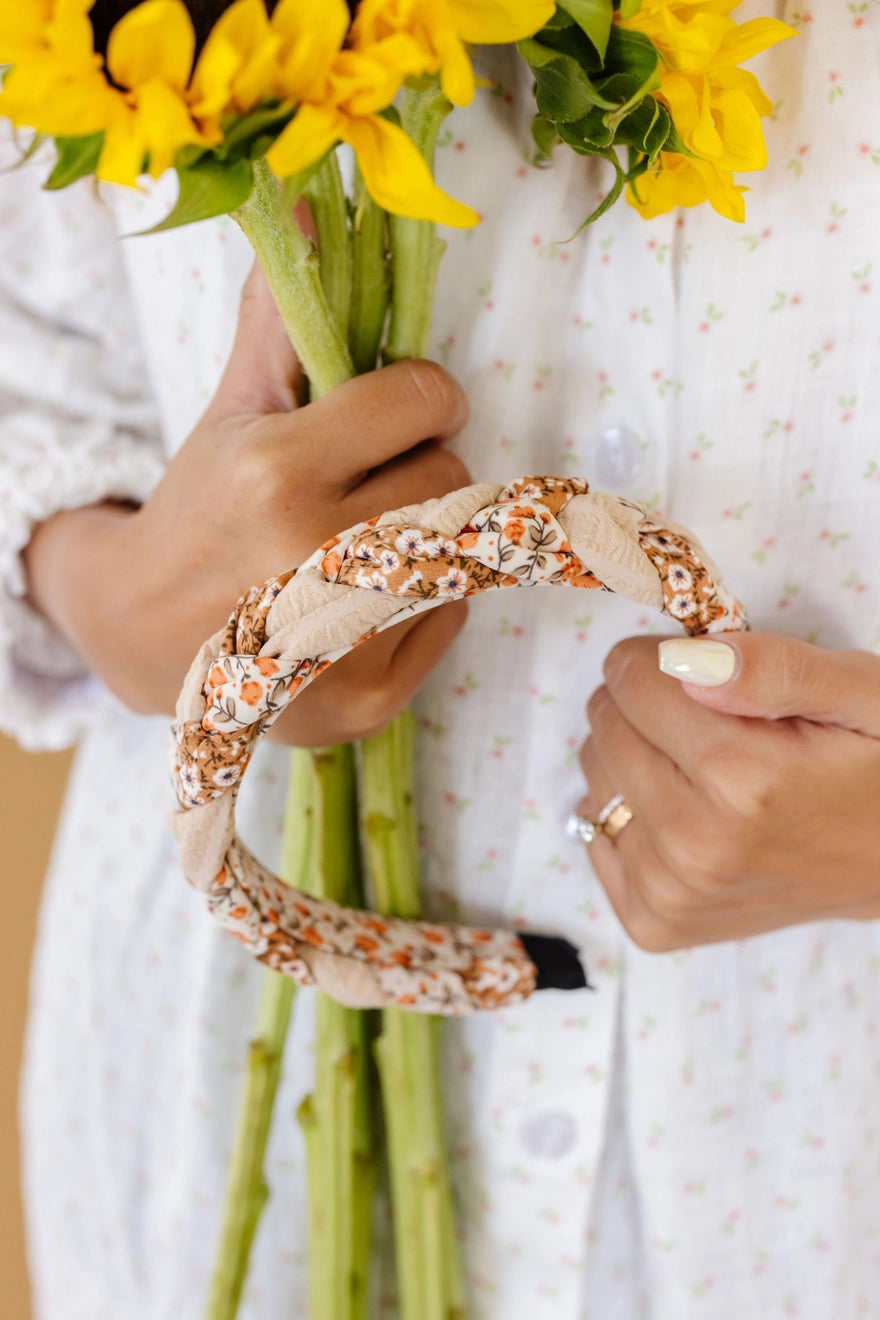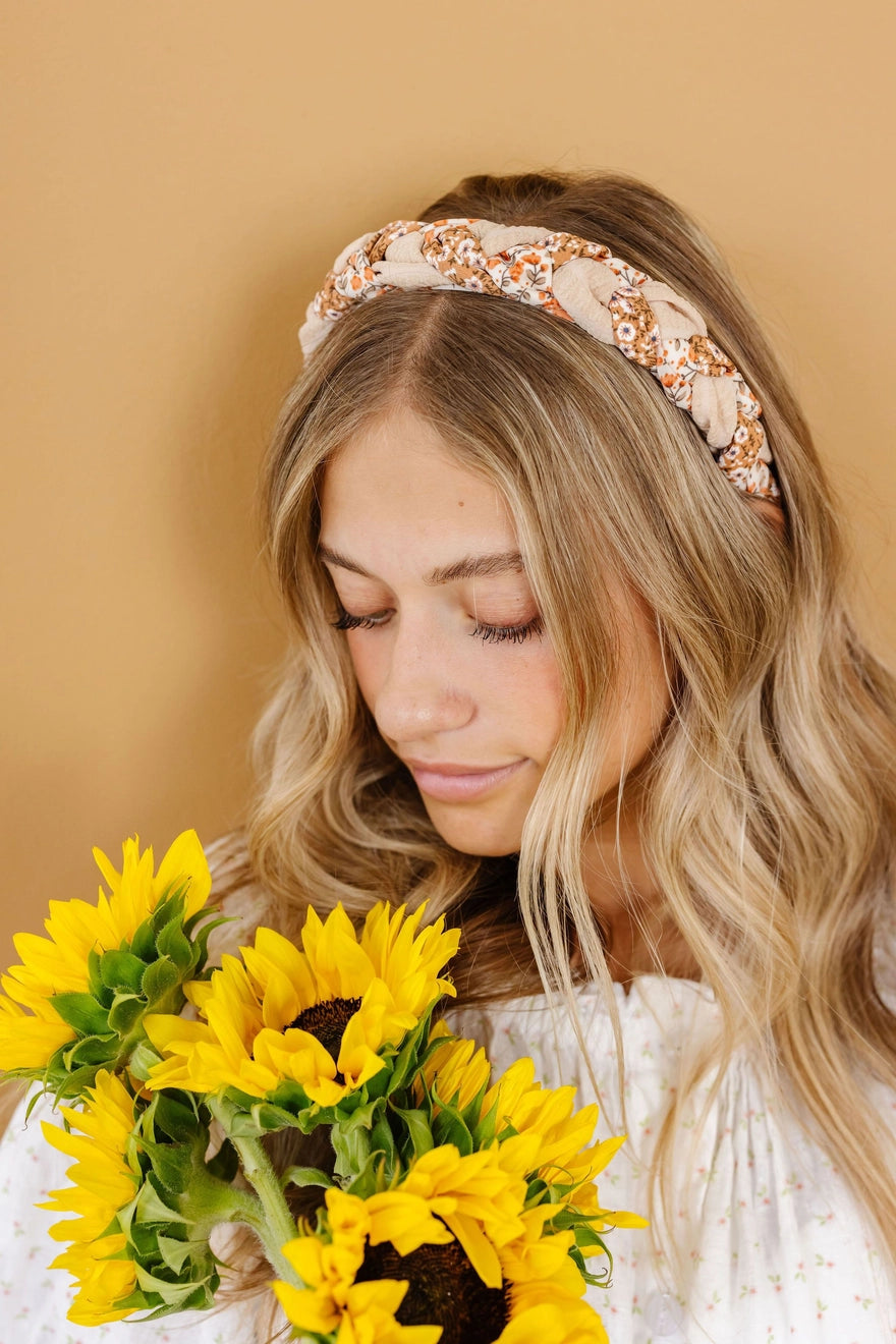 This headband is adorable + has the cutest braided design on the top and includes 3 different patterns, a rust floral, light orange floral, and a solid tan textured fabric to create the most unique fun headband.