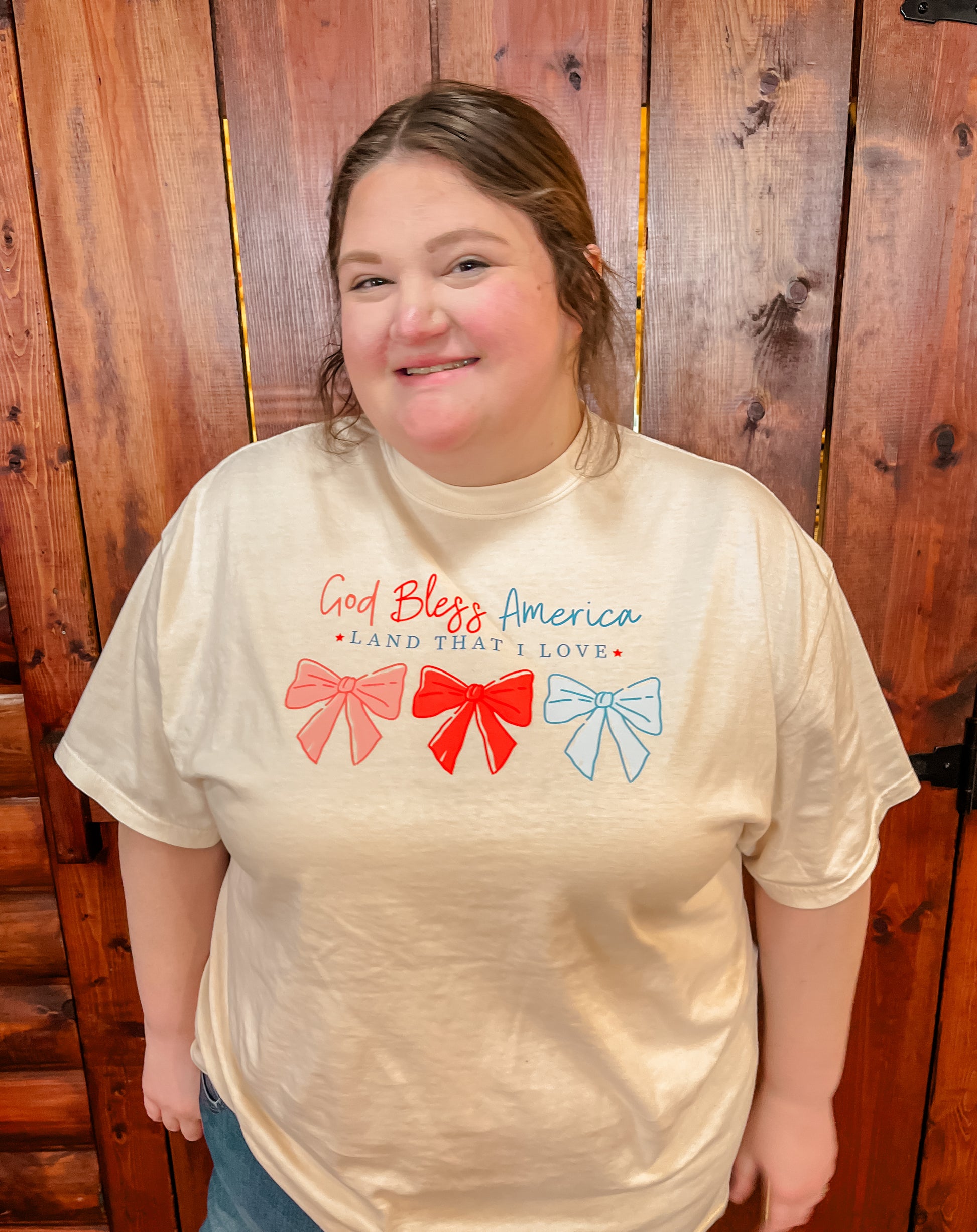 Celebrate your love for America with our God Bless America Bow Tee. This tshirt is perfect for showing off your patriotism and love for this great land. Whether you're enjoying a backyard BBQ or a day at the beach, this tee is sure to make a statement.