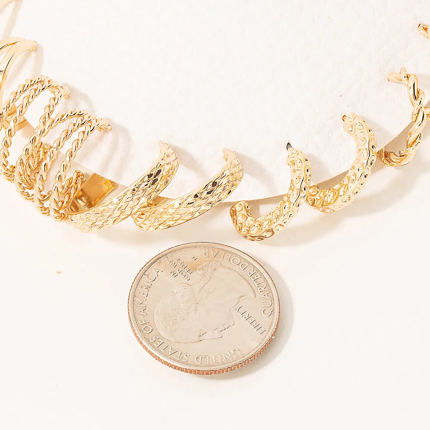 Elevate your earring game with this fabulous five-pair set of gold textured twist hoop earrings! Each pair features a unique twisted design with a gorgeous textured finish that catches the light beautifully. Mix and match throughout your week or stack them for extra sparkle. Whether you're dressing up for a night out or keeping it casual, these versatile hoops are your go-to accessory. Perfect for gifting or treating yourself to instant variety without the guilt!