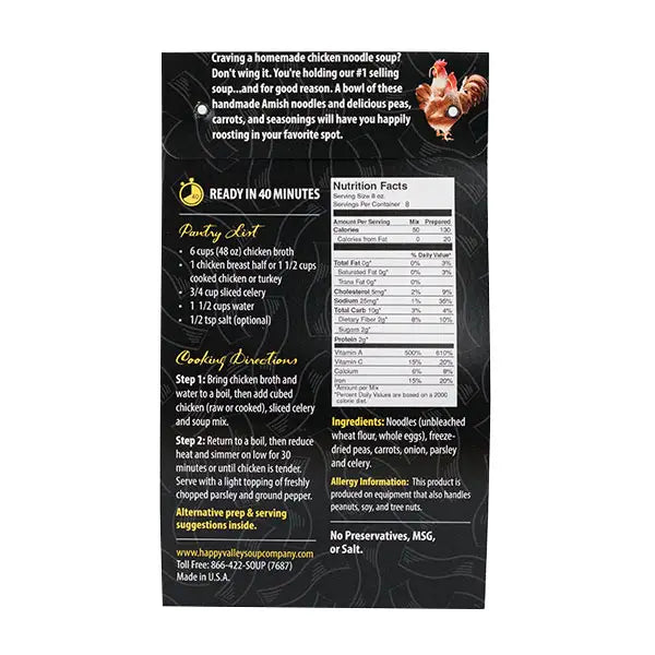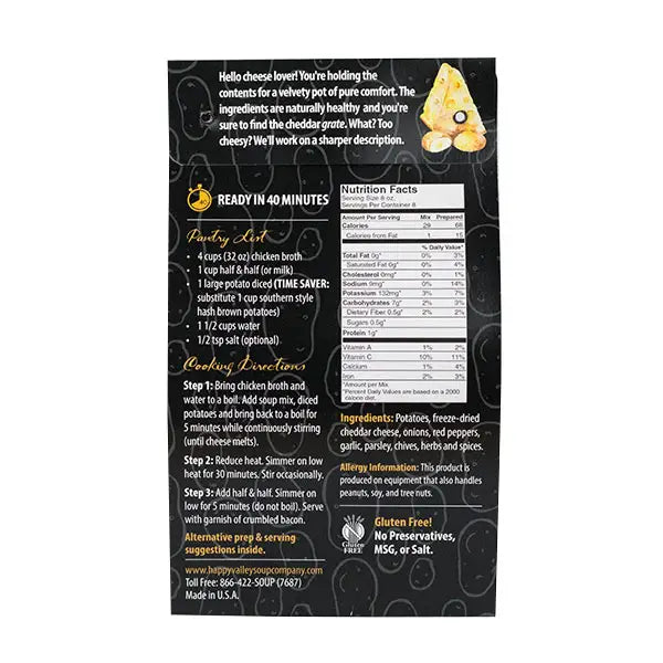 Inspired by family recipes, Happy Valley Soup Company’s natural and delicious soup mixes are made with the finest freeze-dried ingredients containing no preservatives, salt or MSG. These soup mixes are filled by hand in the notorious Happy Valley located in central Pennsylvania. In the interest of sharing the happiness of our region with the masses, we’ve designed soups with fun graphics and descriptions for busy people who get the applause of master chefs when whipping up one of these quick, flavorful, wholesome homemade soups.
