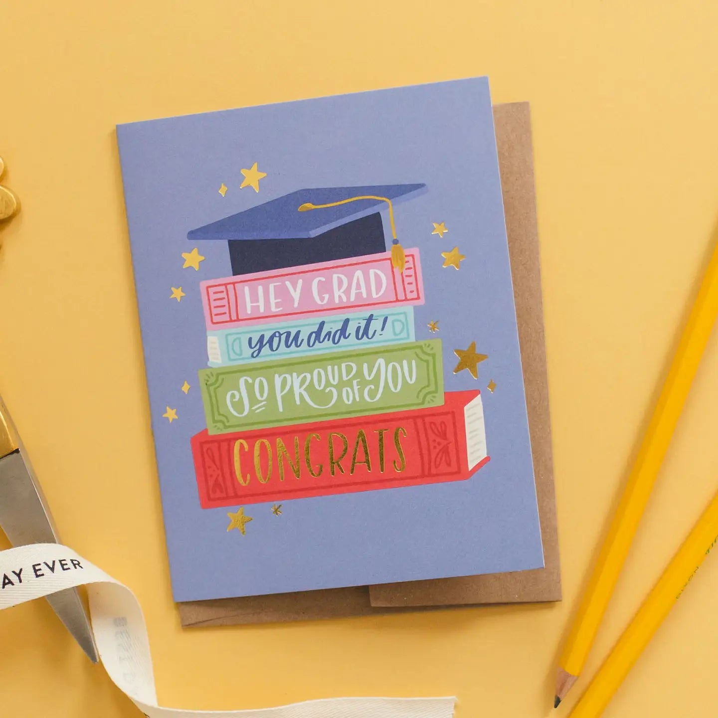 Congratulate your favorite bookworm graduate with our Grad Book Stack Graduation Greeting Card. Featuring with hand-drawn books, this card is a thoughtful way to recognize their academic accomplishments and the chapters yet to come.