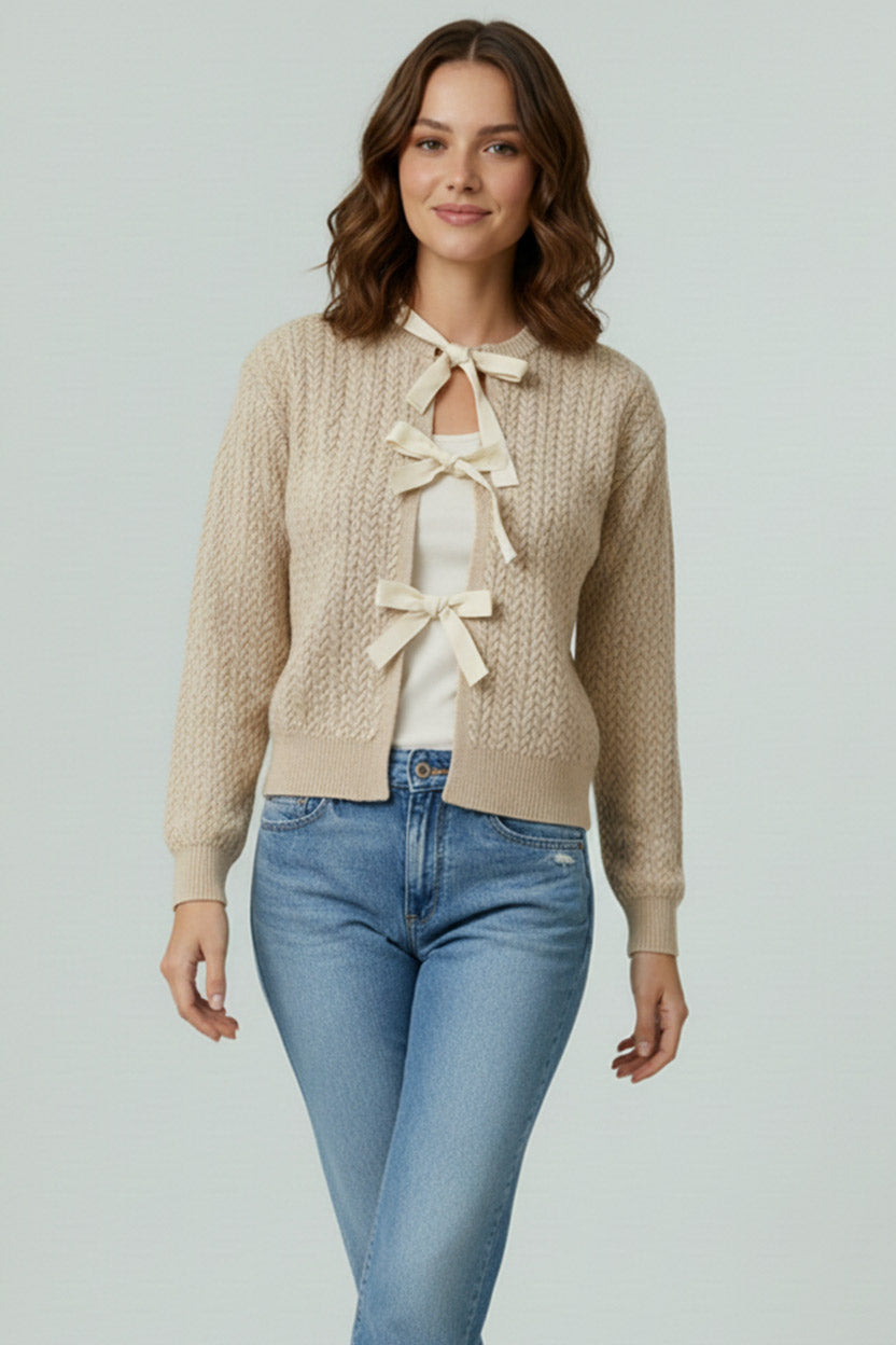 Wrap yourself in cozy charm with the Kori Cable Knit Cardigan! This delightful piece features a classic cable knit texture that's perfect for layering, paired with adorable tied bows that add a playful twist to your everyday style. The bow closures make getting dressed feel like a little celebration, while the soft, comfortable fit keeps you warm and looking effortlessly put-together. Whether you're heading out for coffee or settling in for a relaxed day at home, this cardigan brings both comfort and personality to your wardrobe.