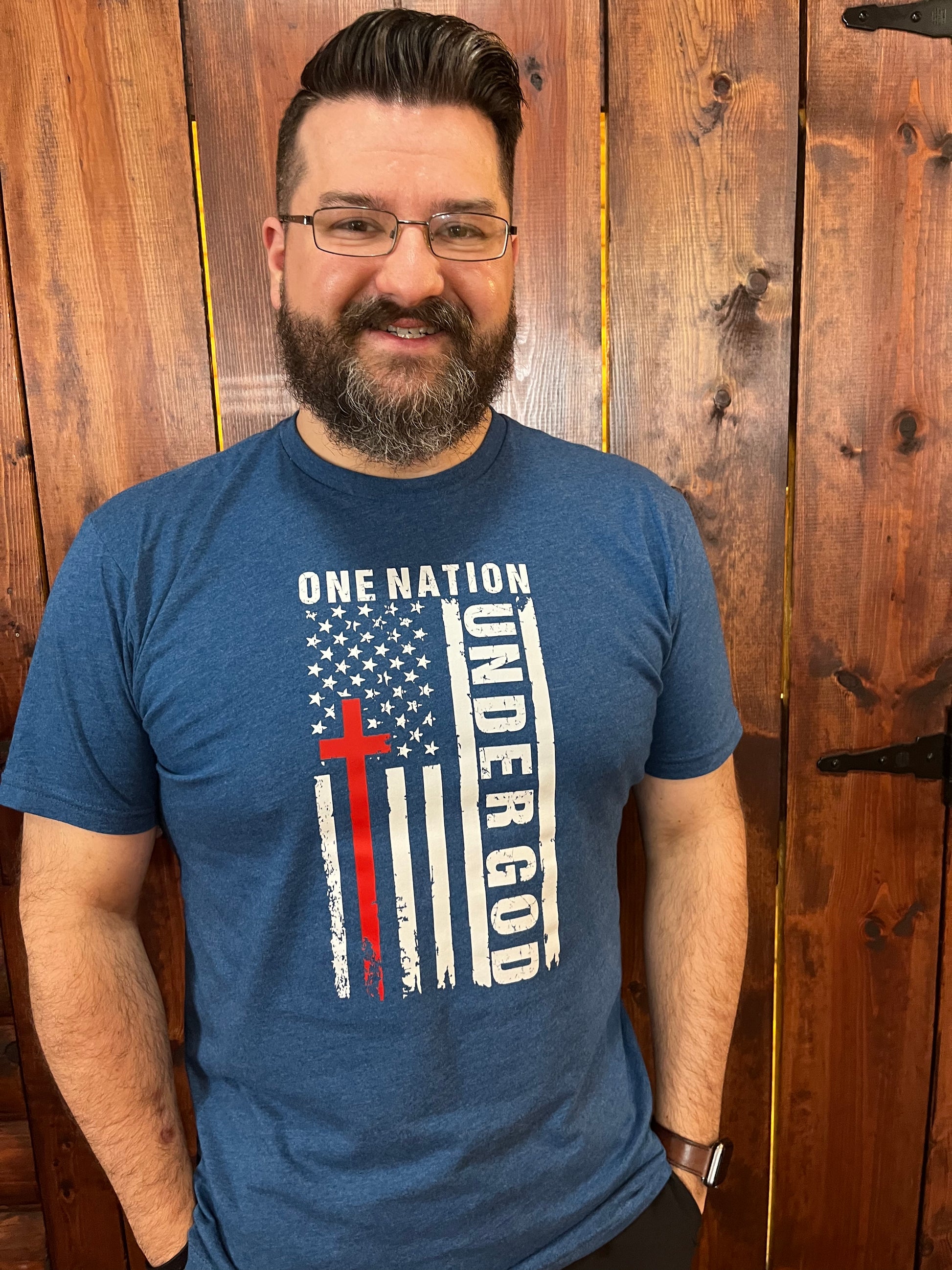 Celebrate unity with the One Nation Under God Flag Tee! This tshirt features the American flag and cross, symbolizing our shared values and beliefs. Show your patriotic and spiritual pride with this unique and playful design.