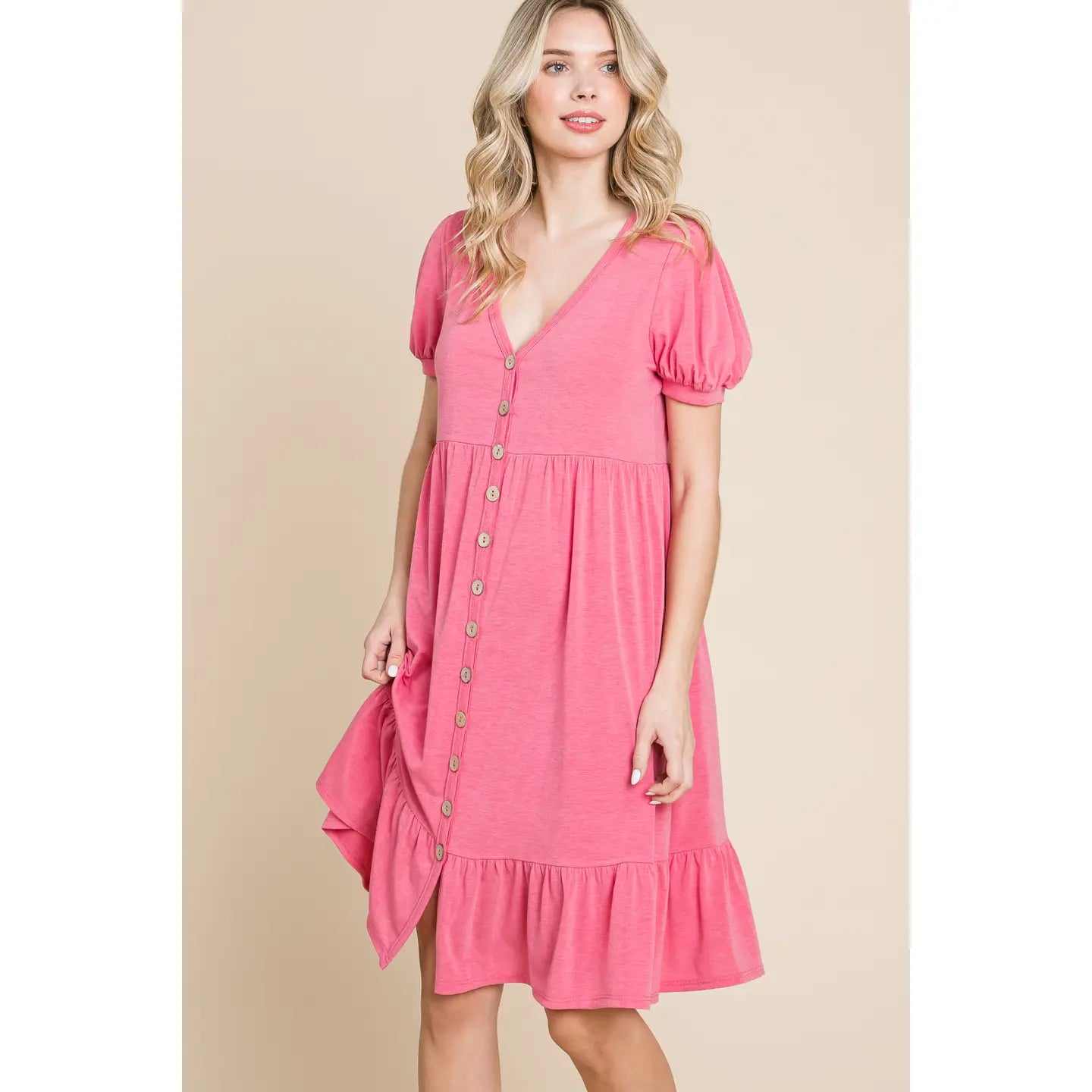 Get ready to twirl in our Rosie Button Down Dress! This fun and flirty dress features a pink button down design with a flattering v-neckline and ruched shoulder detail. The swing style and ruffle hem add a touch of playfulness to this versatile piece. Perfect for any occasion, rock this dress and feel confident and stylish.
