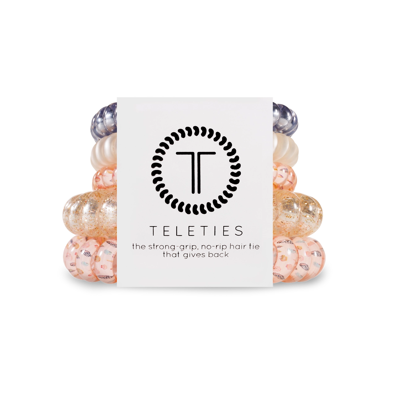 Twist, tie, and toss your hair troubles away with our Teleties Mixed Pack! These colorful hair coils are the ultimate no-crease, no-headache solution for all your styling needs. Wear them as bracelets when not in use, and enjoy tangle-free removal that won't snag or break your hair. Perfect for workouts, pool days, or just keeping your locks in check while looking fabulous! The mixed pack is a perfect combination of 3 small teleties and 2 large teleties!